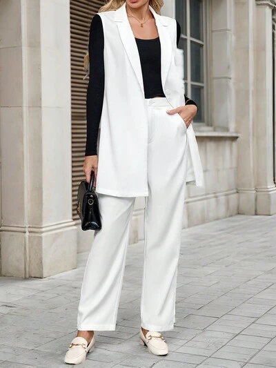 Women Spring & Autumn Plain Lapel Collar Sleeveless Blazer & Pants Elegant 2-Piece Set-45%