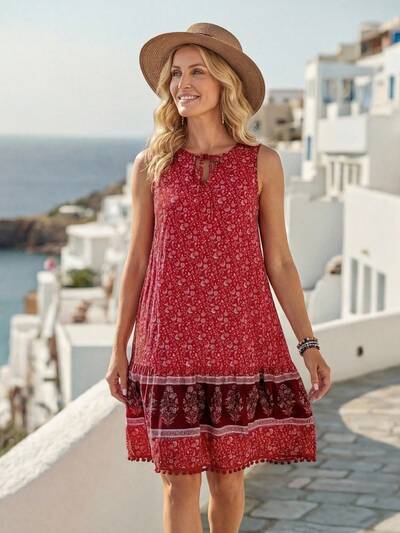 Holiday Printed Splice Sleeveless Dress With Tassel Hem-42%
