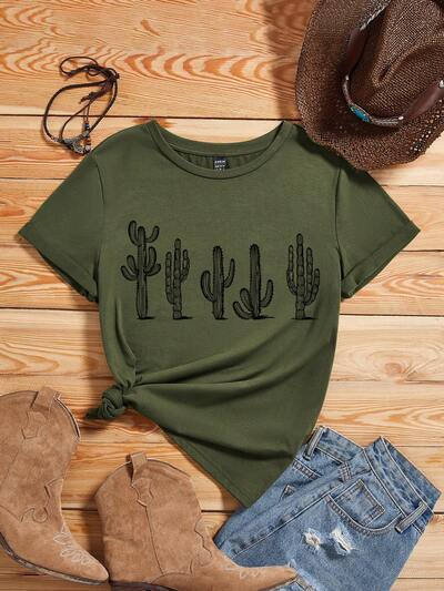 Casual Green Plant & Cactus Print Fitted Round Neck Short Sleeve T-Shirt For Women, Summer Pullover,Casual-52%