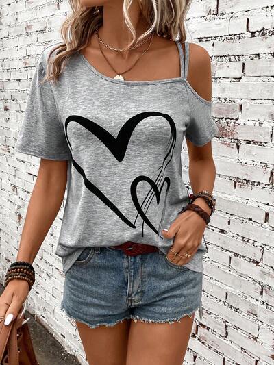 Summer Grey Open Shoulder Heart Printed Music Festival Women's T-Shirts Heart Print Short-Sleeve T-Shirt Women's Summer Casual Classic Print Top Off-Shoulder Asymmetrical Women's T-S