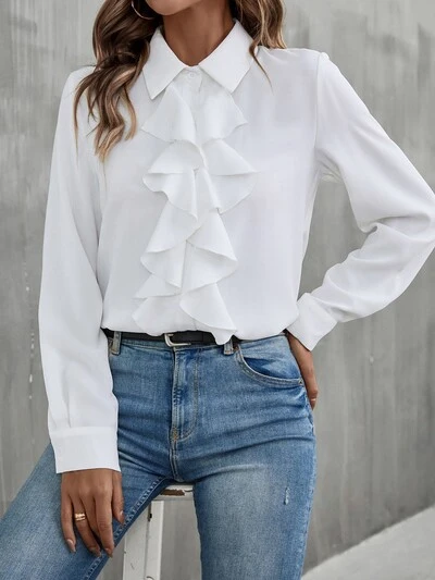 Ruffle Trim Button Up Shirt,Long Sleeve Tops Fall Cloth For Women