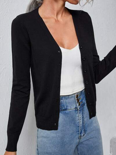 Solid Button Up Cardigan,Long Sleeve Tops,Tops For School In Fall/Winter-42%