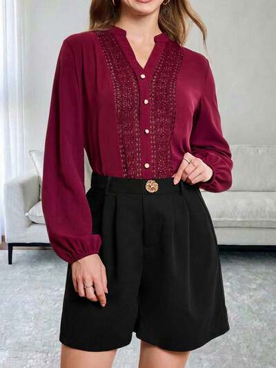 This Elegant Women's Dress Features A Black Base With Delicate, Vintage-Inspired Black Lace Detailing At The Neckline And Shoulders, Adding A Touch Of Modern Sophistication. The Shirt Collar And Tailored Waist Create A Clean And Polished Silhouette, While The Long Sleeves Are Perfect For Autumn And Winter. Whether Commuting To Work To Showcase Professional Taste Or Attending A Fashionable Gathering To Exude Elegance, This Dress, With Its Combination Of Lace And Classic Black, Will Make You A Head-Turner During The New Year Season.