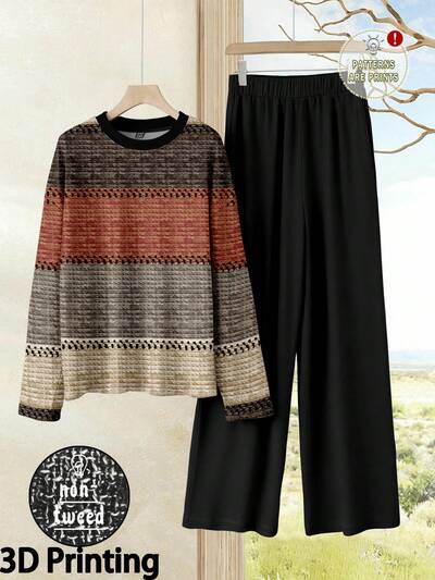 2pcs Women Casual Knit Set, Crew Neck Dropped Shoulder Long Sleeve, Comfortable And Versatile, Suitable For Winter Wear 3D Printing
