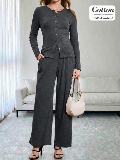 This Elegant Women's Autumn/Winter Suit Features A Dark Gray Ribbed Texture, Exuding A Simple Yet Sophisticated Feel. The Button-Down, Fitted Top Paired With Wide-Leg Trousers Offers A Comfortable And Streamlined Silhouette. The Dark Gray Color Is Understated Yet Stylish, And The Knit Material Is Perfect For Autumn And Winter. It's A Warm And Stylish Choice For The New Year, Suitable For Casual New Year's Wear, Everyday Commutes, And More, Combining Comfort And Fashion.