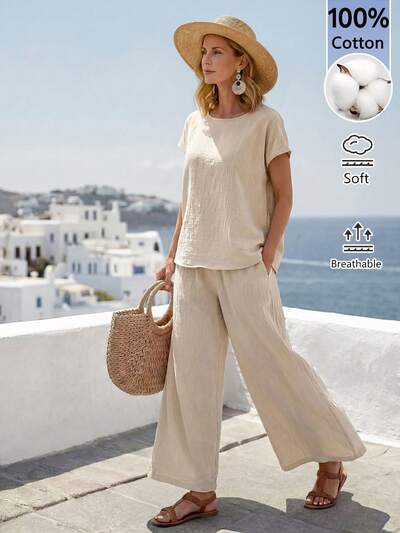 Women's Vacation Casual Solid Color Shirt And Pants 2 Pieces Set Summer Outfits For Women Casual Sets For Women Vacation Outfits Women Holiday Outfits For Women Summer Holiday Outfits Country Style For Women Two Piece Set Women Summer Two Piece Set 2 Piece Vacation Outfit Two Piece Vacation Set 2-Piece Going Out Sets For Women Matching Sets For Women Women's Blouse Set Cotton Women's Clothing 2 Piece Set Women Outfit Teacher Outfits For Women