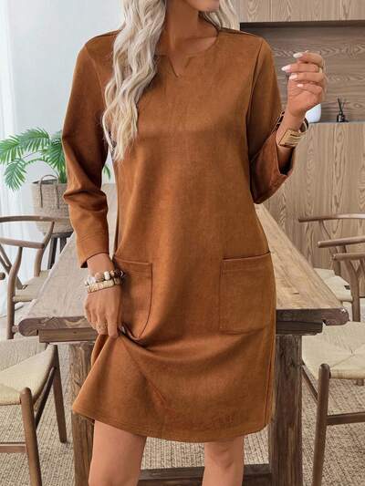 Women's Solid Color V-Neck Long Sleeve Dual Pocket Casual Loose Mini Dress Brown Dress Women Long Sleeve Dress Women Pocket Dress Rust Brown Dress Suede Dress