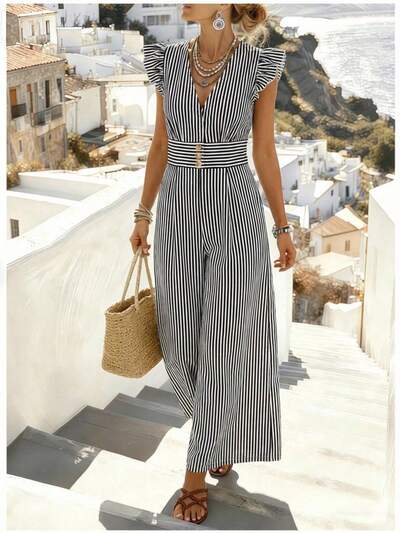 Women's Striped V-Neck Cap Sleeve Casual Jumpsuit Jumpsuits For Women Casual Rompers And Jumpsuits For Women European Summer Outfits Women Summer Outfits For Women Vacation Outfits Women Holiday Outfits For Women Summer Holiday Outfits Women's Jumpsuit Jumpsuits For Women Summer Rompers For Women Vacation Going Out Outfit
