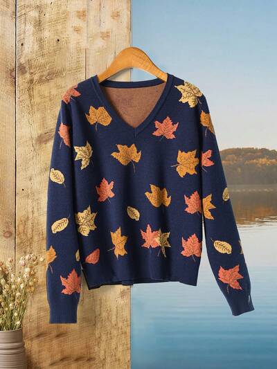 Women Maple Leaf Pattern V-Neck Long Sleeve Casual Loose Knit Sweater, Autumn/Winter-28%