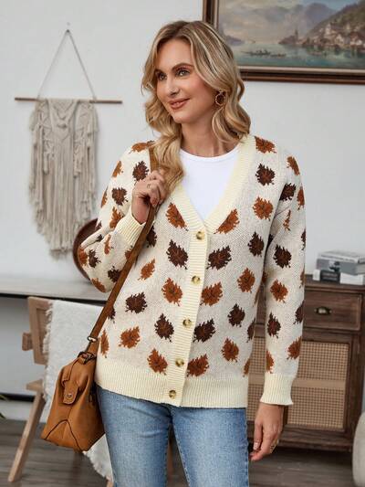 Women Button Down Long Sleeve Casual Leaf Jacquard Knit Cardigan-60%