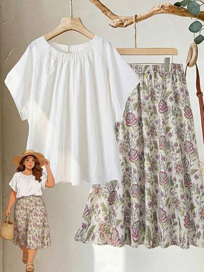 2pc Set Plus Size Women's Summer Casual Vacation Country Solid Color Loose Top And Floral Print Skirt 2 Piece Set, Casual Daily Wear,Suitable For Summer, Vacation, Daily Wear, Festival Outfits For Women,Beach Outfits For Women,Gifts For Mother,Boho Top,Mothers Day Outfit, Daily Wear Casual,Country Concert Outfit ,Modest Two Piece Set, Plus Size Summer Sets,Plus Size Pants Set,Boho Set,2 Piece Casual Sets Woman,Two Piece Set Women, Floral Print Set,Summer Skirt Sets, Summer Outfit Set For Women, Skirts Sets