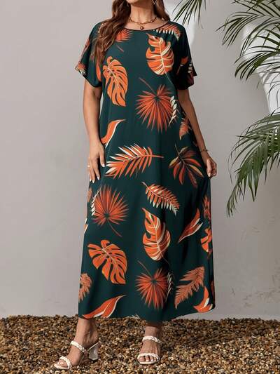 Plus Size Women Tropical Plant Print Short Sleeve Casual Dress