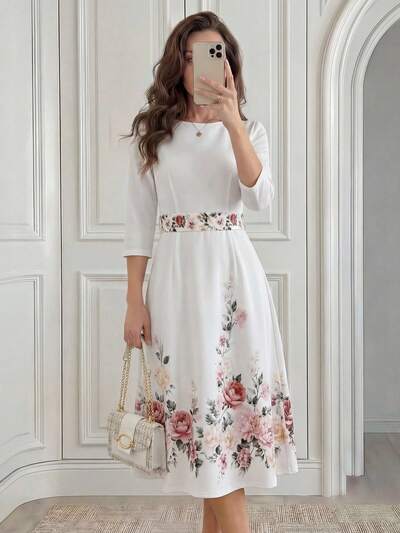 Elegant Floral Print Mid-Length Dress For Commuting,Summer Dress, Elegant Dresses For Ladies,Floral Dress,White Dress