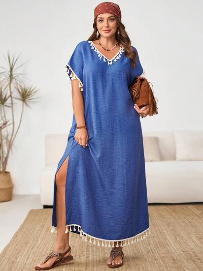 Plus Size Women Vacation Fringe V-Neck Side Slit Hem Casual Dress
