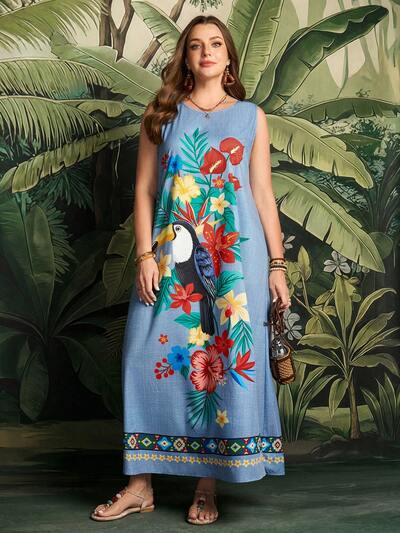 Plus Size Crew Neck Sleeveless Vintage Casual Summer Dress