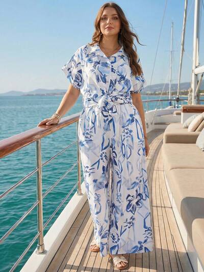 2pc Set Plus Size Women's Summer Casual Vacation Country Floral Print Short Sleeve Loose Blouse Top Shirt And Wide Leg Pants 2 Piece Set With Pockets,Spring/Summer,Summer\Vacation,Summer Holiday,Spring Break Outfits ,Vacation Outfits Women ,Holiday Outfits For Women,Going Out Outfits,2026 New Clothes,Simple And Fashionable For Everyday Wear,Suitable For Summer, Vacation, Daily Wear,Suitable For Summer, Vacation, Daily Wear,Country Concert Outfit ,Modest Two Piece Set, Plus Size Summer Sets,Plus Size Pants Set,Boho Set,Boho Pants Set For Women,Wide Leg Pants Set,2 Piece Casual Sets Woman,Two Piece Set Women Comfy