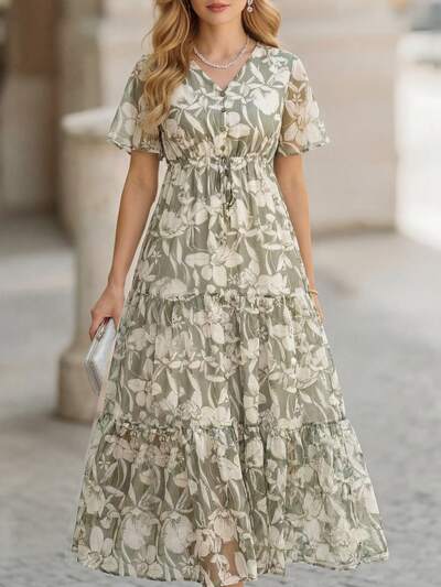 Women's V-Neck Floral Print Twist Casual Long Dress, Summer Floral Print Dress Boho Maxi Dress V-Neck Dress Short Sleeve Dress Tiered Dress,Summer Outfit For Women, Vacation Dresses,Summer Dresses For Women