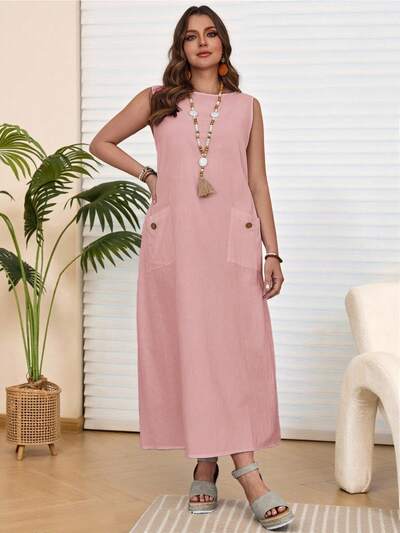 Plus Size Women Solid Color Round Neck Sleeveless Casual Dress With Pockets,Plus Size Women's Summer Casual Vacation Country Solid Color Pink Round Neck Sleeveless Casual Straight Dress With Pockets\Summer\Vacation,Summer Holiday,Spring Break Outfits ,Vacation Outfits Women ,Holiday Outfits For Women,Going Out Outfits,2026 New Clothes,Simple And Fashionable For Everyday Wear,Suitable For Summer, Vacation,Daily Wear, Pink Sundress For Women, Summer Dress With Pocket, White Dress,Casual Dresses For Women,Flowy Dress ,Beach Outfits For Women ,Casual Vacation Boho Dress,Gifts For Mother
