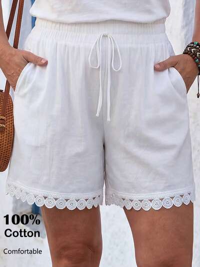 Plus Size Women's Summer Casual Vacation Country Lace Patchwork Solid Color White Shorts With Pockets,Casual Holiday Style,Summer Outfits For Women ,Vacation Outfits Women ,Holiday Outfits For Women,Going Out Outfits, New Clothes,Simple And Fashionable For Everyday Wear,Suitable For Summer, Vacation, Daily Wear, Festival Outfits For Women,Country Concert Outfit,Beach Outfits For Women,Western Style,,Gifts For Mother,Boho Shorts