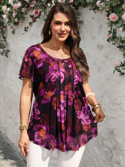 Plus Size Women Summer Short Sleeve Floral Print Tunic Blouse, For Holiday,Summer Holiday,Vacation,Simple And Fashionable For Everyday Wear Beach Vacation Bohemian, Going Out Tops