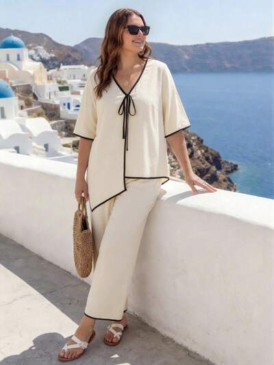 2pc Set Plus Size Women's Summer Casual Vacation Country Asymmetrical Hem Contrast Color Apricot V-Neck Short Sleeve Shirt Top And Pants 2 Piece Set With Pockets,Summer Holiday,Spring Break Outfits ,Vacation Outfits Women ,Holiday Outfits For Women,Going Out Outfits,2026 New Clothes,Simple And Fashionable For Everyday Wear,Suitable For Summer, Vacation, Daily Wear, Two Piece Women Sets Summer, Pant Suit Summer Sets, Women Vacation Outfit Sets,Beach Outfits For Women ,Modest Two Piece Set, Plus Size Summer Sets, Wide Leg Pants Set, Plus Size Pants Set, Summer Suits For Women