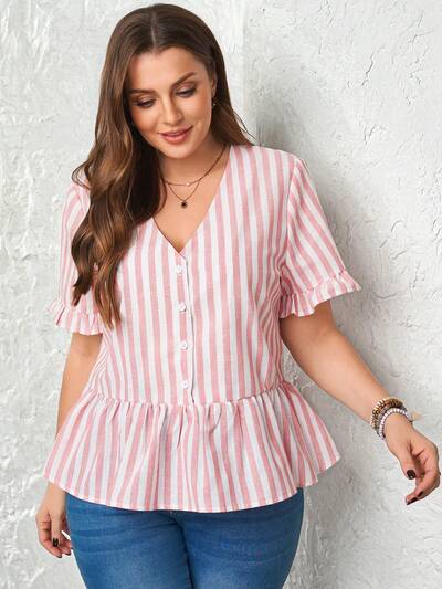 Plus Size Women Striped Single-Breasted Short Sleeve Ruffle Hem Casual Blouse Summer Beach Vacation Going Out Top