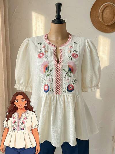 Plus Size Floral Embroidered Casual Vacation Shirt For Summer/Flower Summer Top Summer Summer Spring Spring Women Spring Country Style For Women