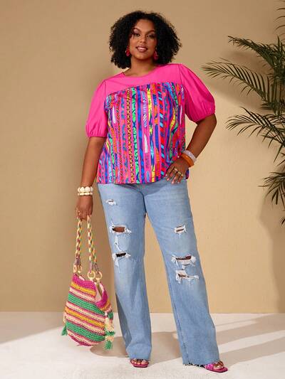 Plus Size Colorful Print Casual Vacation Blouse, Summer Spring Beach Vacation Bohemian, Going Out Tops
