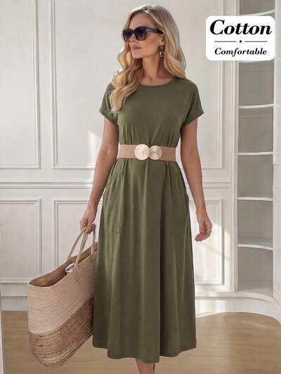 Plus Size Women's Summer Casual Vacation Solid Color Round Neck Ruched Pocket Casual Summer Vacation Short Sleeve Dress,Spring Break Outfits ,Vacation Outfits Women ,Holiday Outfits For Women,Going Out Outfits,2026 New Clothes,Simple And Fashionable For Everyday Wear,Pocket Dress,Dress Modest,Sun Dresses For Women,Sundress,Flowy Dress,Holiday Outfits Boho, Summer Casual Dress,Casual Dresses For Women, Summer Modest Dress,Suitable For Summer, Vacation, Commute, Daily Wear, Summer Dresses