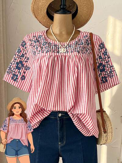 Plus Size Women's Summer Casual Vacation Country Spring Round Neck Short Sleeve Red Striped Floral Print Blouse,Spring Break,Vacation,Holiday,Going Out,2026 New,Simple And Fashionable For Everyday Wear,Casual Vacation Boho Top, Smock Top, Striped Blouse, Boho Chic Top,Suitable For Summer, Vacation, Commute, Daily Wear, Going Out Tops
