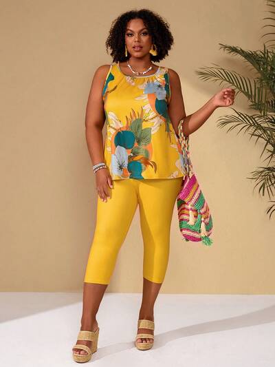 Plus Size Women Floral Print Round Neck Camisole And Leggings Casual 2 Piece Set For Summer/ Vacation Summer Outfits Summer Clothes Spring Spring Outfit Women Spring Clothes Beach Vacation Outfits For Women Bohemian 2 Piece Sets Woman Summer Summer Pant Set Capri Pants Set