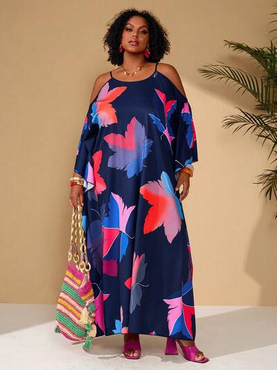 Plus Size Women's Summer Casual Vacation Spring Off-Shoulder All-Over Floral Print Colorful Leaf Print Extra Loose Fit Long Dress/Summer,Summer Holiday,Spring Break Outfits ,Vacation Outfits Women ,Holiday Outfits For Women,Going Out Outfits,2026 New Clothes,Simple And Fashionable For Everyday Wear,Casual Dresses For Women,Flowy Long Dress , Plus Size Hawaiian Dress, Plus Size Maxi Summer Dress, Loose Summer Dress Plus Size Beach Dress Plus Size Resort Wear Plus Size Vacation Dress