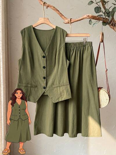 Plus Size Women Casual Brown Corduroy Sleeveless Vest Jacket And Skirt 2 Piece Set With Pockets, Autumn/Winter Summer Outfits Summer Clothes Spring Spring Outfit Women Spring Clothes Country Style For Women Women Summer 2 Pieces Sets Vest And Skirt Set Olive Green Outfit Women