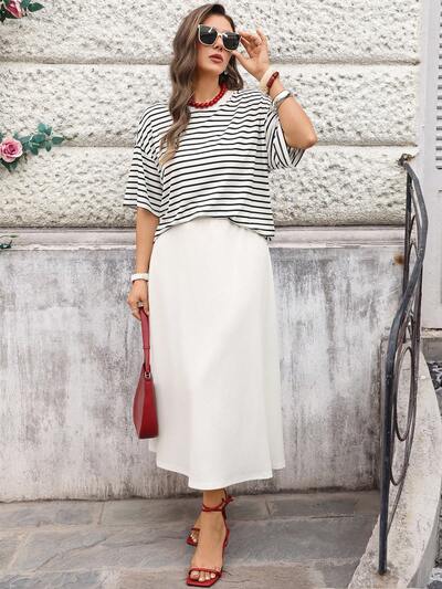 Plus Size Striped T-Shirt + Skirt 2 Pieces Set For Summer/ Vacation, Striped Top With White Skirt Two Piece Set Women Skirt White Skirt And Top Set Striped Skirt Summer Modest Outfits For Women Casual Skirt