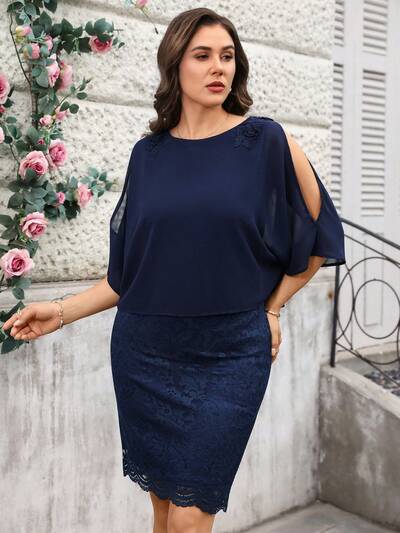 Plus Size Solid Color Round Neck Batwing Sleeve Fashionable Minimalist Lace Patchwork Dress For Summer/Elegant/ Vacation,Wedding Guest Dress For Women Navy Blue Plus Size Dress Plus Size Cold Shoulder Dress Plus Size Navy Dress Cold Shoulder Plus Size Plus Size Women Dress Plus Size Dresses Navy Blue Dress