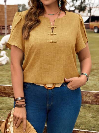 Plus Size Solid Color Petal Sleeve Button-Up Shirt, Summer