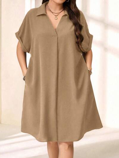 Plus Size Solid Color Collared Short Sleeve Casual Mini Dress, Minimalist Style,Summer Outfits For Women