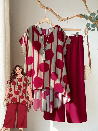 Plus Size Vacation Casual Striped & Circle Print Shirt And Pants 2 Pieces Set,Summer/Spring Country Style For Women Two Piece Set Women Summer Pants Sets