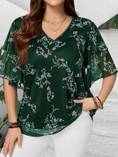 Plus Size Women's Summer Casual Vacation V Neck Short Sleeve Floral Print Ruffle Sleeve Tunic Blouse,Summer Holiday,Vacation,Simple And Fashionable For Everyday Wear,Spring Break,Vacation,Holiday,Going Out,2026 New,Simple And Fashionable For Everyday Wear, Green Blouse