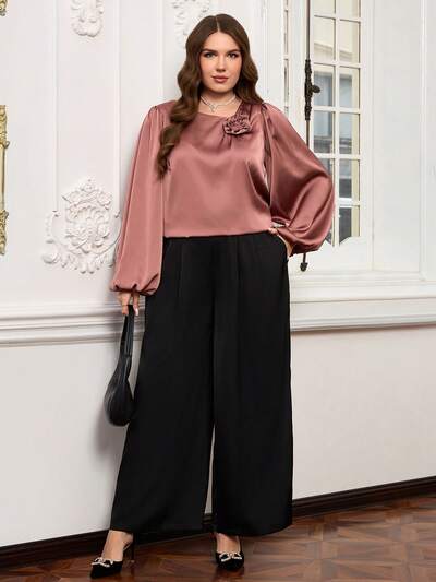 Plus Size Women's Solid Color 3D Floral Decor Lantern Sleeve Shirt And Pocket Wide Leg Pants Elegant 2 Piece Set Winter Outfit For Women Christmas Outfit For Women New Year Clothes Elegant Party Set Blouse And Pants Set Professional Clothes Women Sets Wide Leg Pants Set Lantern Sleeve Blouse Puffy Sleeves Top Spring Break Outfits