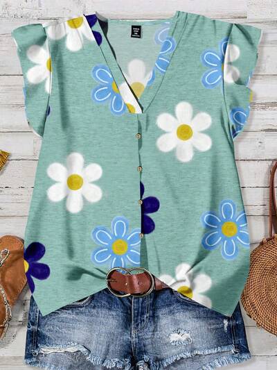 Women's Casual Floral Print V-Neck Ruffle Armhole Top, Summer Flower Tops For Women Women's Summer Top Spring Casual Tops Women Summer,Casual