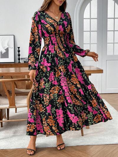 Plus Size Women's Fall/Early Spring Casual Fashion Vacation Floral Print Shirred Lantern Sleeve Drawstring Waist Dress,, Plus Size Floral Dress, Plus Size Vacation Dress, Plus Size Boho Dress, Plus Size Resort Wear, Vacation Dresses Woman Curve,Flowy Dress,Going Out Outfits,2026 New Clothes,Simple And Fashionable For Everyday Wear,Early Spring,Vacation Outfits Women ,Holiday Outfits For Women,Spring Outfit Women,Valentine's Day ,Valentine Outfits For Women , Long Floral Dress Women, Boho Dress Women