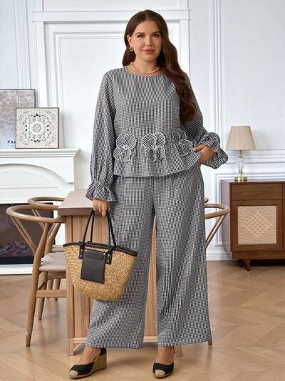 2pcs Plus Size Women Fall/Early Spring Casual Fashion Vacation Plaid Round Neck Long Sleeve Floral Decor Shirt And Pants 2 Piece Set With Pockets,Going Out Outfits,2026 New Clothes,Simple And Fashionable For Everyday Wear,2025 New ,Spring Outfits For Women, Blouse And Pants Set, Co Ords Sets Women, Modest Two Piece Set, Curve Pants Set, Top And Pants Set,Vacation Outfits Women ,Holiday Outfits For Women,Spring Outfit Women,Valentine's Day ,Valentine Outfits For Women