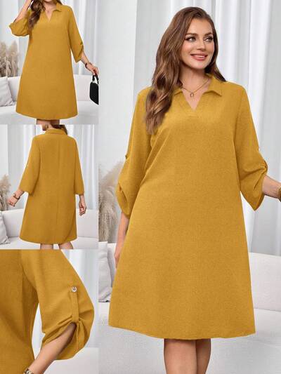 Plus Size Solid Color Turndown Collar Casual Versatile 3/4 Sleeve Dress