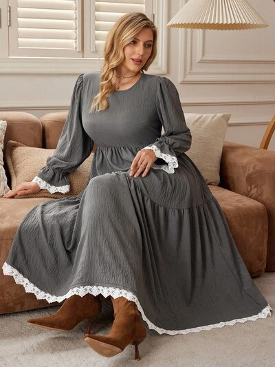 Plus Size Women's Casual Everyday Commute Contrast Lace Ruffle Sleeve Tiered Hem Dress, Gray Long Sleeve Dress Long Casual Dress, 2025 New, , Clothes For New Year Christmas Clothes Elegant Dress Women Winter Clothes For Women Cozy Fall And Winter Clothes,New Year Clothes Winter Clothes For Women