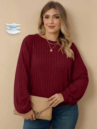 Plus Size Women's Solid Color Round Neck Lantern Sleeve Casual Ribbed Sweatshirt/Winter