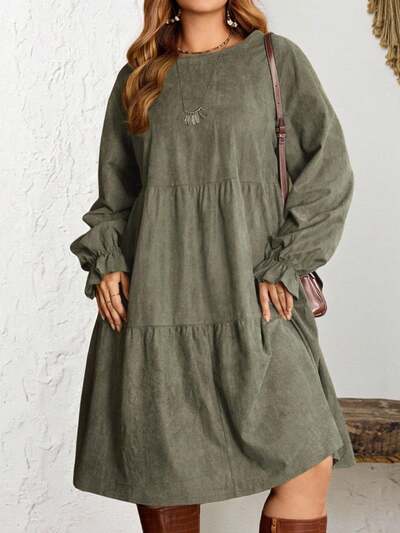 Plus Size Green Color Long Sleeve Casual Dress, Autumn/Winter,2025 New, Thanksgiving, Thanksgiving Outfit For Women