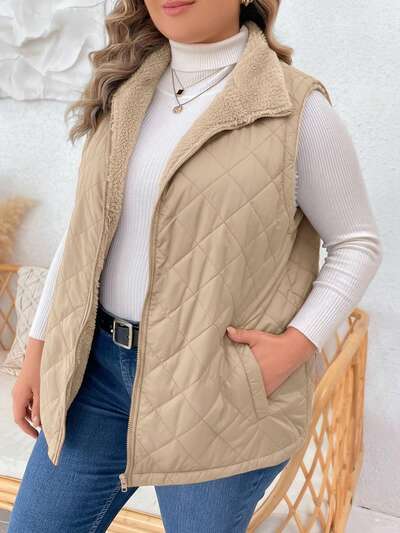 Plus Size Women Solid Color Zipper Front Pocket Thermal Lined Sleeveless Casual Winter Jacket Puffer Vest Tan Vest Winter Vests For Women Women Vest Women Quilted Vest Winter Clothes For Women Jackets For Women Casual Outerwear Women