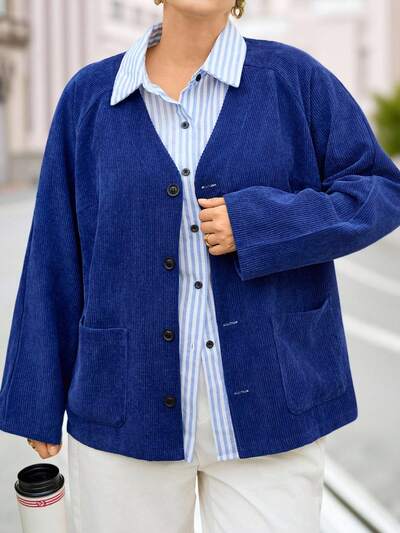 Plus Size Women's Winter Casual Long Sleeve Solid Blue Corduroy Coats With Pockets, Autumn,Fall,Vintage,Going Out,2025 New,Christmas,New Year,Thanksgiving