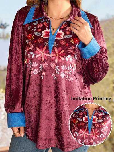 Plus Size Elegant Floral Print Blouse, Autumn Winter Cozy Fall And Winter Casual Blouse Country Style